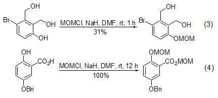 酚羥基與(氯甲基)甲基醚的反應(yīng)更容易[6,7]。當(dāng)?shù)孜锓肿又型瑫r含有醇羥基和酚羥基時,通過控制反應(yīng)條件,反應(yīng)優(yōu)先在酚羥基上發(fā)生 (式3)[8]。當(dāng)?shù)孜锓肿又型瑫r含有酚羥基和羧酸時,可以在將酚轉(zhuǎn)化成醚的同時將酸轉(zhuǎn)化成相應(yīng)的酯 (式4)[9]。