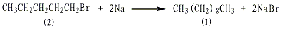 用23g(1.0mol)金屬鈉同75.5g(62mL,0.5mol)1-溴戊烷(2)或99g(65.5mL,0.5mol)1-碘戊烷按上述制備正辛烷的操作方法,收集171~174℃的餾分,得約28g正癸烷(1),收率79%。 [28]