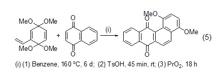 在合成具有生物活性的化合物方面,1,4-萘醌還具有非常重要的作用。如與吡咯的反應(yīng)為制備抗生素提供了很好的前體 (式4)[4],與乙烯基醌縮醛的Diels-Alder反應(yīng)則為合成非線形苯并多環(huán)抗生素提供了一種很好的方法 (式5)[5]。