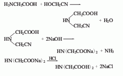 1.氯乙酸鈉法 由氯乙酸制備氯乙酸鈉,再與水合肼反應(yīng)生成肼抱二乙酸,最后在亞硝酸鈉作用下制得亞氨基乙酸。
