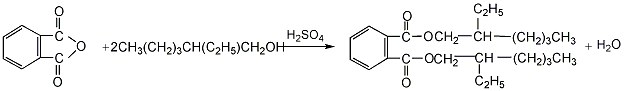 3.間歇法 常壓下進行酯化反應,反應產(chǎn)物經(jīng)中和、水洗、減壓蒸餾,回收醇后脫色、壓濾,即得成品。其工藝條件如下:原料配比為苯酐∶辛醇=1∶2(質(zhì)量),催化劑量為總物料量的0.25%~0.3%(質(zhì)量),酯化時加入的活性炭為總物料量的0.1%~0.3%(質(zhì)量);酯化溫度150℃,酯化時間約為3h。粗酯洗滌的熱水溫度為80~85℃;蒸餾回收辛醇的溫度130~140℃,塔內(nèi)殘壓不高于93.31kPa;粗酯閃點要達190℃以上。生產(chǎn)優(yōu)級品,需將脫醇后的粗酯進行蒸餾,而后壓濾。酯化反應式如