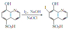 將制得的8-羥基喹啉-5-磺酸加到20%的氫氧化鈉溶液中,充分?jǐn)嚢瑁鋮s至20℃以下,再加入已溶于氫氧化鈉稀溶液的碘片及次氯酸鈉,進(jìn)行反應(yīng):