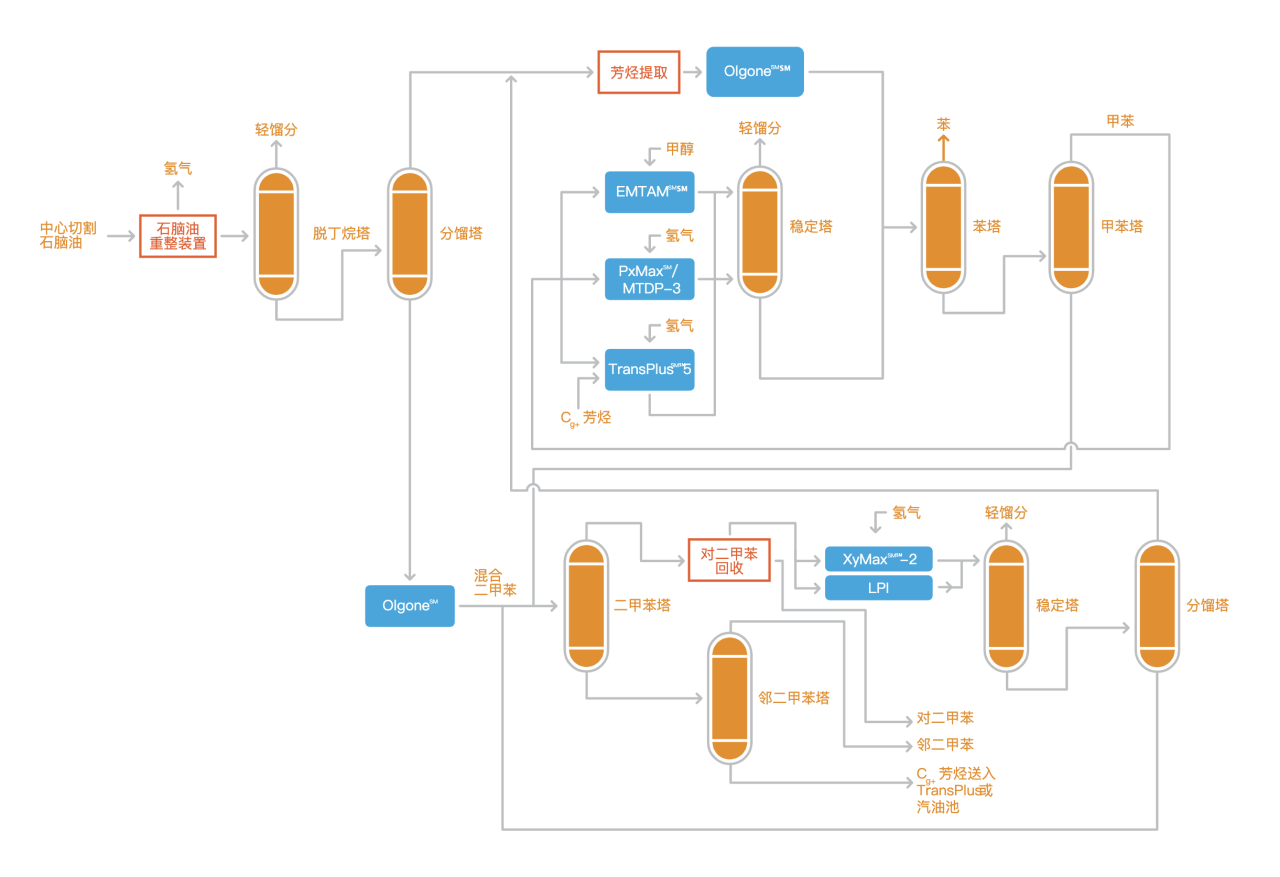 方法三:鉑重組法,用常壓蒸餾獲得的輕汽油(初餾點約138℃),提取大于65℃餾分,先經(jīng)過含鉬催化劑,催化加氫脫出有危害性的雜物,再經(jīng)過鉑催化劑開展重組,用二乙二醇醚溶劑萃取,隨后再逐塔精餾,獲得苯、甲苯、二甲苯等生成物。