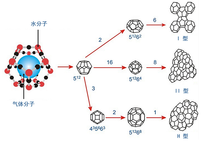 可燃冰主要成分由三種結(jié)構(gòu),I型由甲烷、乙烷、二氧化碳、硫化氫等較小直徑的氣體分子和水分子結(jié)合而成;Ⅱ型由甲烷、乙烷等小分子,丙烷及異丁烷等較大分子和水分子結(jié)合而成;H型由氣體組分中有異戊烷等較大氣體分子和水分子結(jié)合而成。
