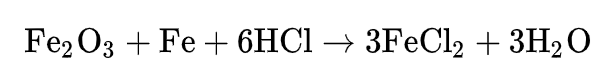 在后期加工處理鐵或鋼材(擠壓、軋制、鍍鋅等)以前,可以用鹽酸化學(xué)反應(yīng)掉表層的銹或鐵氧化物。一般 采用濃度為18%的鹽酸溶液做為酸洗劑來清洗碳鋼: