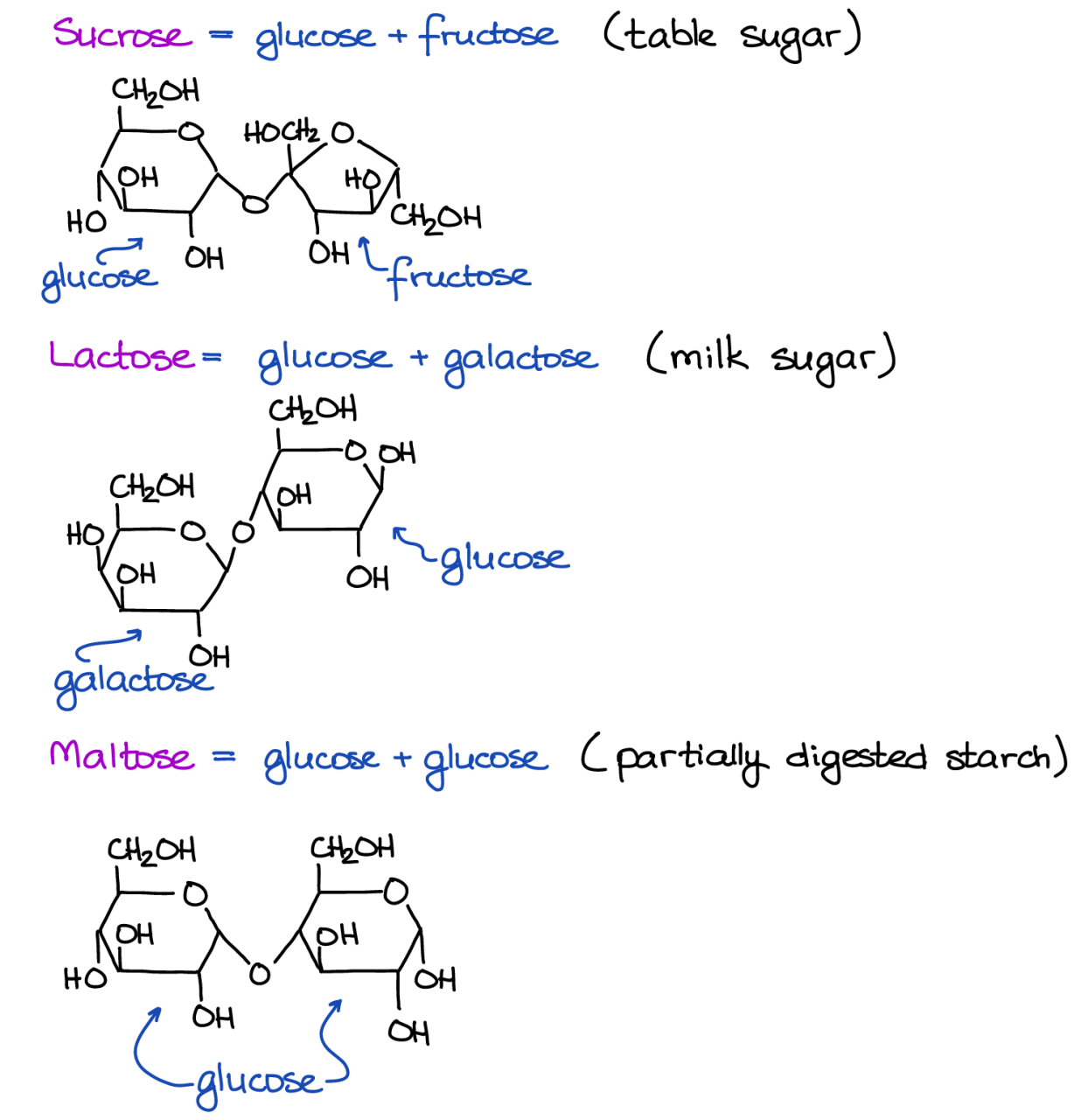 二糖具有更大的雙環(huán)結(jié)構(gòu),并具有基于連接單糖的各種特性以及糖苷鍵的位置和立體化學(xué)。許多天然存在的糖是葡萄糖的二糖和一些其他單糖。蔗糖(食用糖)由葡萄糖和果糖這兩種單糖組成。乳糖(牛奶糖)由葡萄糖和半乳糖的單糖組成。