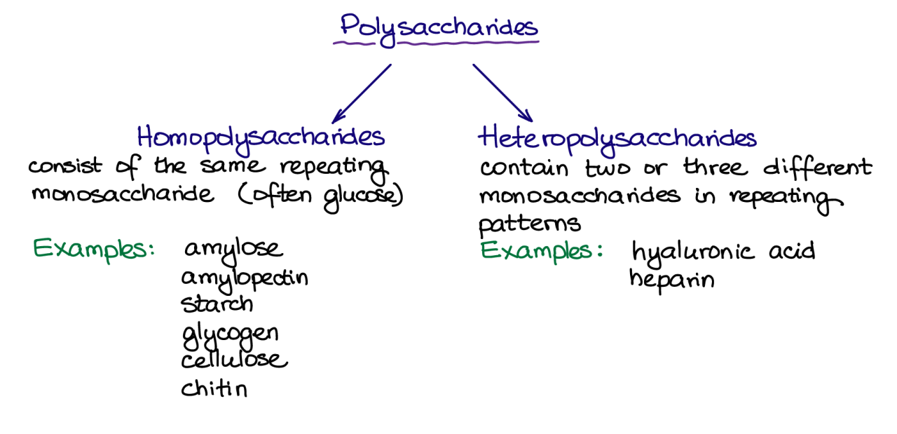 糖苷鍵出現(xiàn)在每個單元的同一位置的多糖會形成長鏈,這些長鏈會圍繞自身纏繞而形成螺旋結(jié)構(gòu)。或者,一些單元可以具有多個糖苷鍵,從而導(dǎo)致松散的分支結(jié)構(gòu)。最后,多糖可以完全由一個單糖單元(同質(zhì)多糖)組成,也可以具有兩種或三種不同單糖(雜多糖)的重復(fù)模式。