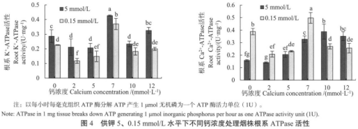 鉀是植物生長必需的營養(yǎng)元素,也是公認的煙草品質元素,但我國植煙土壤供鉀不足及煙株鉀素利用率低等問題,嚴重影響著我國煙葉鉀含量。由于北方植煙土壤主要以2:1型黏土礦物為主,干濕交替頻繁,土壤中鈣含量較高;而南方施用石灰改良土壤酸堿度,增加了土壤鈣含量,導致土壤中Ca2+、K+等交換性陽離子比例失調,煙草吸收鉀困難且煙葉鉀含量整體較低。因此研究鈣對煙草鉀吸收的影響,對提高煙葉鉀含量具有重要意義。植株鉀吸收與外界鈣濃度密切相關且關系十分復雜。有研究發(fā)現(xiàn),高鈣處理可以提高烤煙根系和煙葉的鉀含量,Ca2+可以防止細胞內K+外滲,減少根系陽離子流失,有利于K+的吸收。然而也有研究表明,土壤有效鈣含量與煙葉鉀含量呈負相關,鈣對鉀有一定的拮抗作用,Ca2+的存在會與K+競爭質膜上的吸收通道,減少植株對鉀的吸收。目前關于外界鈣濃度對煙草鉀吸收的影響研究,多集中在正常鉀水平下且兩者關系并不十分明確。因此本文以煙草品種K326為研究材料,采用室內水培的方法,通過對煙株進行兩種鉀水平和不同鈣濃度組合處理,探索低鉀脅迫下外界鈣濃度與煙草鉀吸收之間的關系,為鉀鈣平衡施肥提供依據。