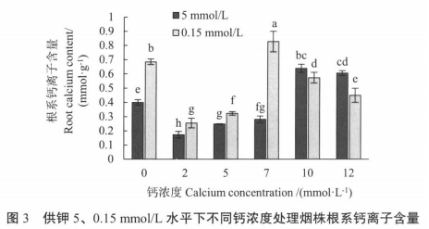 當煙苗長至3片真葉時,挑選長勢一致的煙苗,于蒸餾水中饑餓處理24h,再分別置于不同鉀和鈣濃度的營養(yǎng)液中培養(yǎng)12d后,取煙株地上部及根系進行指標測定。試驗共設12個處理,包括2個鉀水平,分別為常鉀(5mmol/L)和低鉀(0.15mmol/L),以及6個鈣濃度(0、2、5、7、10、12mmol/L)。試驗所用營養(yǎng)液根據Hoagland完全營養(yǎng)溶液改良而成,去除營養(yǎng)液配方中所有鈣離子,使用氯化鈣調節(jié)營養(yǎng)液中鈣濃度,調節(jié)pH至6.5。7.0。在培養(yǎng)過程中,使用充氣泵每El通氣2h,每4d更換一次營養(yǎng)液,以保持營養(yǎng)液的成分相對穩(wěn)定。每處理6個重復。