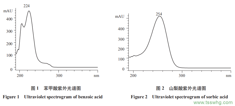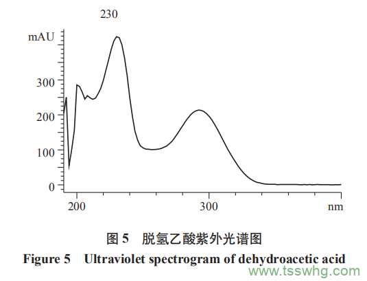 用二極管陣列檢測器對標(biāo)準(zhǔn)混合溶液在150 ~ 400nm 范圍內(nèi)進(jìn)行波長掃描,發(fā)現(xiàn)苯甲酸在 224nm、山梨酸在 254nm、糖精鈉在207nm、安賽蜜在 227nm、脫氫乙酸在 230nm 處有最大吸收,如圖 1 ~ 5 所示。根據(jù)樣品特征及前處理過程中試劑的干擾情況,選擇檢測波長為 230nm,在此波長條件下,五種添加劑可同時進(jìn)行檢測并獲得最大靈敏度。