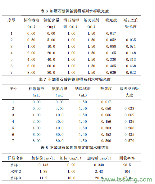 酒石酸鉀鈉在氨氮測定中做為鈣鎂等金屬離子掩蔽劑并非必須加入的試劑。在水樣經(jīng)蒸餾處理后或在盲樣考核中,可不加入酒石酸鉀鈉溶液,以減小水樣空白。以酒石酸鉀鈉為掩蔽劑時,產(chǎn)生白色沉淀可采取離心或微孔濾膜抽濾去除干擾。本文配制的酒石酸鉀鈉-六偏磷酸鈉復合掩蔽劑對水樣中鈣鎂等金屬離子掩蔽效果良好,有條件的實驗室可探索更適宜的試劑做掩蔽劑。