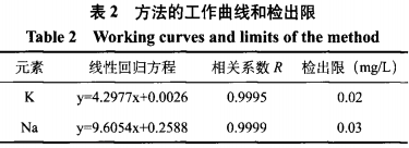 ICP-MS法測定水基膠中K、 Na含量采用在線加入內(nèi)標(biāo)的方法定量。將標(biāo)準(zhǔn)工作溶液配制成濃度分別為0.5、1、5、10、 20、50、 100mg/L 的工作溶液,表2顯示了K、Na各元素的線性回歸方程、相關(guān)系數(shù)和檢出限。