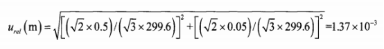 天平校準和分辨率是樣品稱量引入不確定度的主要來源。根據計量檢定證書,由最大允許誤差和分辨率引入的誤差分別為土0.5mg和0.05mg。樣品的稱量為0.2996g,按照均勻分布考慮,那么樣品稱重引入的不確定度Ured(m)為: