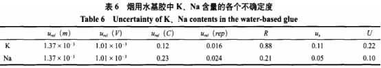 然后,表6總結了水基膠樣品S-1中K、Na含量的各個不確定度。