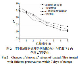通過測定魚肉的L*,a*,b*值來表征烤制魷魚片顏色的變化。在不同防腐劑處理下烤制魷魚片的色度L*值如圖2所示。從圖中可以看出,隨著貯藏時間的增長,使用3種不同防腐劑處理的烤制魷魚片和空白組烤制魷魚片的L*值隨著貯藏時間的增長呈現(xiàn)下降的趨勢,L*值不斷降低說明魷魚肉質(zhì)的光澤度在貯藏期間有所降低,貯藏初期顏色較為鮮亮到后期顏色略微暗淡,魷魚肉的可接受程度也逐漸降低。造成這種現(xiàn)象的原因可能是隨貯藏時間的延長,肌紅蛋白發(fā)生氧化生成高鐵肌紅蛋白,反而使亮度下降。故而L*值下降趨緩。這與盧蕓等研究結(jié)果一致。在整個貯藏過程中,ε-聚賴氨酸鹽處理組烤制魷魚的L*值顯著高于山梨酸鉀處理組、乳酸鏈球菌素處理組和空白組,且山梨酸鉀處理組烤制魷魚片的L*值與空白組無顯著性差異,這說明ε-聚賴氨酸鹽可以更好的減緩烤制魷魚片L*值的下降。ε-聚賴氨酸鹽可用作為食品的護色劑,其對食品具有良好的保鮮及護色效果,還具有抗氧化、防止食品褐變的作用。