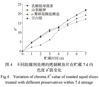 在不同防腐劑處理下烤制魷魚片的色度b*值如圖4所示。由圖4可知,隨著貯藏時間的增長,使用3種不同防腐劑處理的烤制魷魚和空白組烤制魷魚的b*值呈現(xiàn)上升的趨勢,這表明魷魚隨著貯藏期的延長,魷魚肉有發(fā)黃的趨勢。黃卉等人認(rèn)為隨著貯藏期的延長,在光線、溫度、酶等引發(fā)劑的作用下魚肉脂肪逐漸被氧化,使得肉逐漸變黃。0d時,4組烤制魷魚的b*值無顯著性差異,說明烤制魷魚片的脂質(zhì)氧化與腐敗程度對肌肉的顏色影響顯著,各種防腐劑能有效及控制魷魚肌肉中的蛋白質(zhì)分解。在貯藏的1~7d,ε-聚賴氨酸鹽處理組烤制魷魚的b*值均顯著低于其他3組,可能的原因是ε-聚賴氨酸鹽阻止了烤制魷魚組織中的脂質(zhì)過氧化,又由于ε-聚賴氨酸鹽能防止食品褐變,所以ε-聚賴氨酸鹽可以更好的減緩烤制魷魚b*值的上升。在本實驗中經(jīng)ε-聚賴氨酸鹽組處理的烤制魷魚片的b*值的變化速度要明顯低于其他組。