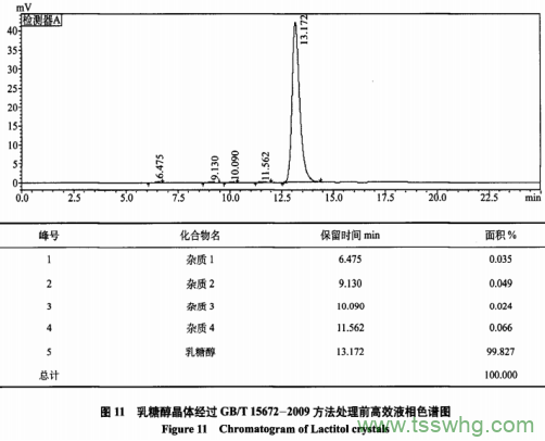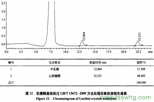 由結(jié)果分析可知:除去酸峰后,半乳糖純度51.598%,山梨糖醇純度48.402%,乳糖醇未再檢出,之前所含的少量雜質(zhì)在酸解液中占比極微已檢測(cè)不出。大部分乳糖醇經(jīng)酸解處理后分解出半乳糖和山梨糖醇。乳糖醇本身沒有還原性,但通過GB/T15672—2009檢測(cè)方法,會(huì)水解出具有還原性的半乳糖,乳糖醇會(huì)被判定為還原糖而被計(jì)算在總糖中,從而提高了總糖含量檢測(cè)結(jié)果。在添加有乳糖醇的無糖或低糖食品的檢測(cè)過程,如果通過GB/T15672—2009的檢測(cè)方法檢測(cè),會(huì)導(dǎo)致這些食品超過無糖或低糖標(biāo)準(zhǔn),從而對(duì)食品品質(zhì)產(chǎn)生誤判。