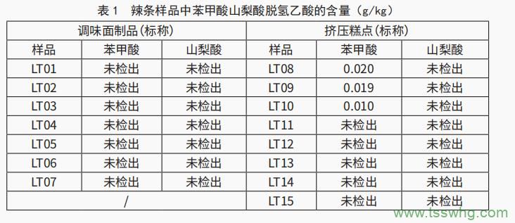 15個(gè)辣條樣品中,有7個(gè)是標(biāo)稱為“調(diào)味面制品”的辣條,8個(gè)是標(biāo)稱為“擠壓糕點(diǎn)”的辣條,這些辣條中的苯甲酸、山梨酸的測(cè)定結(jié)果見表1。
