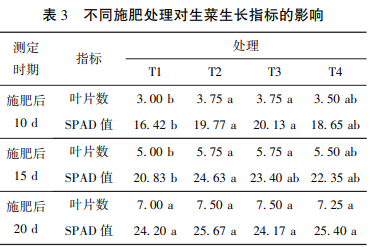 1 不同施肥處理對上海青和生菜生長指標(biāo)的影響不同施肥處理后10d、15d、20d,上海青和生菜的生長指標(biāo)測定結(jié)果分別見表2和表3。
