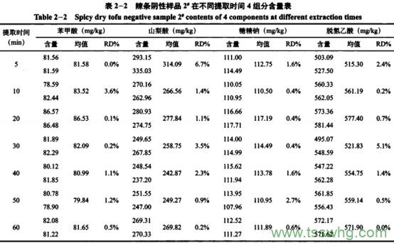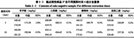 參考國標(biāo)GB5009:28-2016一般性食品中樣品提取時(shí)間,本試驗(yàn)對不同類別的糕點(diǎn)進(jìn)行加標(biāo)試驗(yàn)來考察樣品提取時(shí)間對目標(biāo)成分提取效率的影響,考察的提取時(shí)間分別為5min、10min、20min、30min、40min、50min、60min,稱取糕點(diǎn)、月餅、辣條樣品各3份,精密加入混合標(biāo)準(zhǔn)使用液2.0mL,上機(jī)測定,得到4組分在不同提取時(shí)間的含量,結(jié)果見表2。結(jié)果顯示,超聲提取10min,4種目標(biāo)組分的數(shù)值基本達(dá)到穩(wěn)定,提取時(shí)間為20min所得含量最高,本次試驗(yàn)最終選擇超聲時(shí)間為20min。