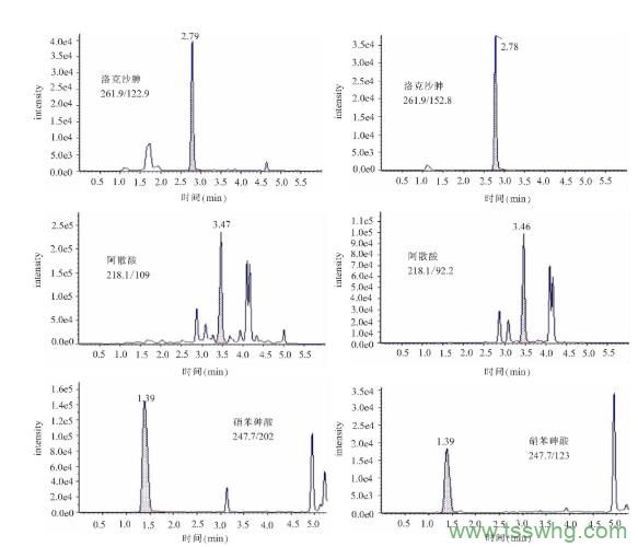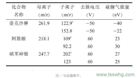甲醇、乙腈、甲酸(色譜純,J.T.Baker公司);水為超純水;10%甲醇水溶液;1%甲酸水-乙腈溶液(25∶75,V∶V):取1.0m L甲酸加入到99 m L 75%乙腈水溶液中;洛克沙胂(含量99.0%)、阿散酸(含量99.0%)和硝苯砷酸(含量99.0%)標(biāo)準(zhǔn)品(Dr.Ehrenstorfer Gmb H公司,德國)。