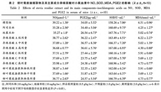 由表2可知,阿司匹林與模型組相比,血清中N0和MDA水平分別降低10.05%和34.72%,S0D活力明顯升高6.59%,PGE2水平無(wú)顯著變化。地塞米松與模型組相比。小鼠血清中N0、PGE2和MDA水平明顯降低,分別降低10.07%,22.06%和22.89%,S0D活力明顯升高6%。在低劑量組中,異綠原酸A、異綠原酸C和甜葉菊廢渣提取物與模型組相比,N0、S0D、MDA和PGE2均無(wú)顯著性變化。在中劑量組中,與小鼠模型組相比,異綠原酸A和異綠原酸C均可明顯提高S0D活力,分別提高5.12%和5.52%,且異綠原酸C使PGE2含量降低30.25%。而甜葉菊廢渣提取物對(duì)4個(gè)指標(biāo)均未產(chǎn)生明顯影響,中劑量組中抗炎作用效果排序?yàn)楫惥G原酸C>異綠原酸A>甜葉菊廢渣提取物。在高劑量組中,異綠原酸A使S0D活力顯著提高5.95%,使MDA水平下降33.95%,異綠原酸C和甜葉菊廢渣提取物均能明顯改變4個(gè)指標(biāo)的水平,異綠原酸C組比模型組中的N0、PGE2和MDA含量分別下降8.26%,28.4%和27.34%,S0D活力提高6.76%,甜葉菊廢渣提取物組比模型組的N0、PGE2和MDA含量分別下降6.25%,27.84%和27.34%,S0D活力提高6.25%,這說(shuō)明異綠原酸A、異綠原酸C和甜葉菊廢渣提取物高劑量組的抗炎效果均強(qiáng)于低劑量組,高劑量組中抗炎作用排序?yàn)楫惥G原酸C≈甜葉菊廢渣提取物>異綠原酸A,這與體外RAW264.7細(xì)胞的抗炎活性研究結(jié)果基本一致。甜葉菊廢渣提取物與異綠原酸C抗炎效果相當(dāng),推測(cè)甜葉菊廢渣提取物中除異綠原酸A和異綠原酸C外,其它多酚黃酮類(lèi)物質(zhì)也具有抗炎活性。劉明月幽報(bào)道槲皮素能顯著抑制RAW264.7細(xì)胞分泌促炎介質(zhì)TNF-α、PGE2和N0的含量達(dá)到抗炎作用。Fikw等研究顯示咖啡酸能使關(guān)節(jié)炎大鼠模型中MDA含量顯著降低30%,N0含量顯著降低33%,對(duì)大鼠關(guān)節(jié)炎有一定抑制作用。