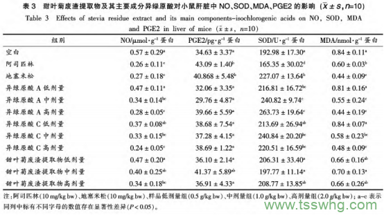 利用小鼠足趾腫脹炎癥模型.研究小鼠肝臟中N0、S0D、MDA和PGE2的含量。由表3可知,阿司匹林組與模型組相比N0、MDA和PGE2含量分別降低54.39%,14.32%和28.57%,S0D活力比模型組提高24.43%;地塞米松組N0和MDA水平分別比模型組降低52.63%和47.62%,PGE2含量和SOD活力分別比模型組提高18.01%和17.67%,有很好的抗炎作用。在低劑量樣品組中,異綠原酸A和異綠原酸C與模型組相比SOD活力分別提高12.35%和10.73%,且異綠原酸C組比模型組的N0含量降低35.09%。甜葉菊廢渣提取物對(duì)4個(gè)指標(biāo)含量均無(wú)顯著作用。在中劑量樣品組中,異綠原酸A和異綠原酸C與模型組相比,可顯著降低N0和MDA的水平,提高S0D活力。其中異綠原酸A組比模型組N0和MDA含量分別降低40.35%和34.52%。S0D活力提高24.79%:異綠原酸C組比模型組N0和MDA含量分別降低42.11%和30.95%,S0D活力提高24.80%,甜葉菊廢渣提取物組對(duì)4個(gè)指標(biāo)含量均無(wú)顯著性影響,中劑量樣品組抗炎效果為:異綠原酸A≈異綠原酸C>甜葉菊廢渣提取物。在高劑量樣品組中,異綠原酸A組比模型組N0和MDA含量分別降低50.88%和47.62%,S0D活力提高36.66%,PGE2含量與模型組無(wú)顯著性差異。異綠原酸C組比模型組N0和MDA含量分別降低57.89%和42.86%,S0D活力提高14.27%,PGE2含量與模型組無(wú)顯著性差異。甜葉菊廢渣提取組僅N0含量比模型組降低40.35%,而S0D、MDA和PGE2水平與模型組相比均無(wú)顯著性差異。高劑量樣品組抗炎效果為:異綠原酸A≈異綠原酸C>甜葉菊廢渣提取物。綜上,異綠原酸A和異綠原酸C具有較強(qiáng)的體內(nèi)抗炎作用,且二者在肝臟中的抗炎效果無(wú)顯著性差異,而甜葉菊廢渣提取物的抗炎效果弱于異綠原酸A和異綠原酸C,推測(cè)異綠原酸A和異綠原酸C可能是甜葉菊廢渣提取物在肝臟中發(fā)揮抗炎作用的主要成分。
