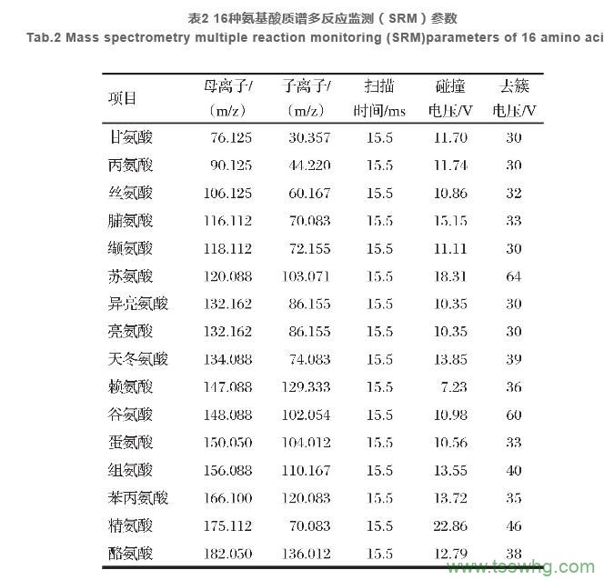 離子源:可加熱電噴霧離子源(H-ESI);掃描模式:正離子掃描;噴霧電壓:3 500 V;鞘氣:35 psi;輔助氣:10 psi;離子傳輸管溫度:350℃;源溫度:300℃;16種氨基酸質(zhì)譜多反應(yīng)監(jiān)測(SRM)參數(shù)見表2。