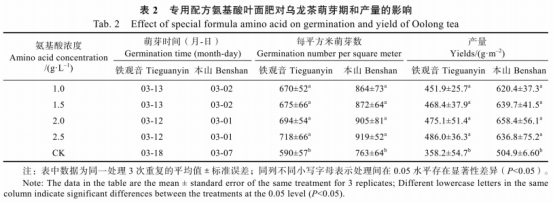 從表2可見,噴施專用配方氨基酸葉面肥均提早“鐵觀音”和“本山”的茶樹萌芽時問,4個氨基酸濃度處理問差異不顯著,但與對照差異顯著,萌芽時間提早了3~5d;“鐵觀音”和“本山”的萌芽數(shù)分別提高了13.61%~21.70%、13.18%~20.46%。噴施專用配方氨基酸葉面肥可提高“鐵觀音”和“本山”鮮葉產(chǎn)量,不同氨基酸濃度處理之問差異不顯著,但均顯著高于對照處理,“鐵觀音”和“本山”分別比對照提高了26.16%~35.68%、22.87%~26.12%。因此,茶樹萌芽前噴施專用配方氨基酸葉面肥,能提早茶樹的萌芽,提高茶芽密度,從而提高茶葉產(chǎn)量。