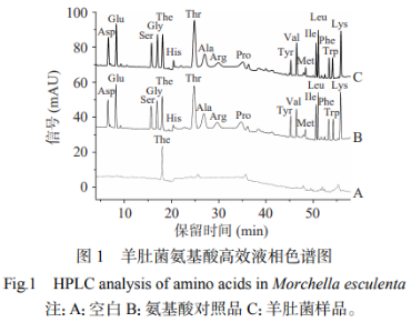 按“1.2.4.6”項(xiàng)下進(jìn)行試驗(yàn),結(jié)果表明,羊肚菌中17種氨基酸的平均回收率在92.42%~101.16%之間,RSD<2.0%,說明氨基酸的回收率較好。詳見表3。