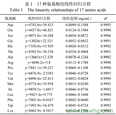 精密吸取不同濃度對(duì)照品溶液,衍生化處理后注入色譜儀,結(jié)果見表1。由表1可知,17種氨基酸在線性范圍內(nèi)與峰面積呈現(xiàn)良好的線性關(guān)系,相關(guān)系數(shù)R2>0.9990。詳見表1。