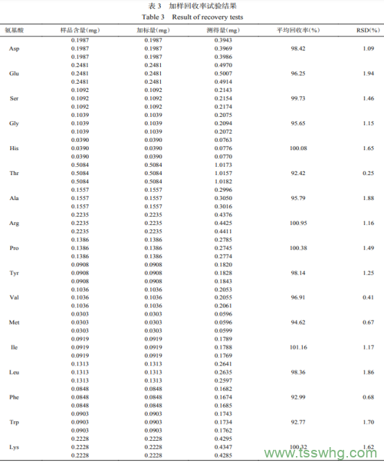 按“1.2.4.4”項(xiàng)方法進(jìn)行測(cè)定,結(jié)果顯示,17種氨基酸峰(Asp、Glu、Ser、Gly、His、Thr、Ala、Arg、Pro、Tyr、Val、Met、Ile、Leu、Phe、Trp、Lys)面積的RSD為0.56%、1.72%、1.87%、0.42%、1.53%、1.85%、1.49%、0.80%、0.93%、1.68%、0.60%、1.17%、0.92%、1.48%、0.77%、0.96%、1.65%,RSD均小于2.0%,表明該方法具有較好的重復(fù)性。