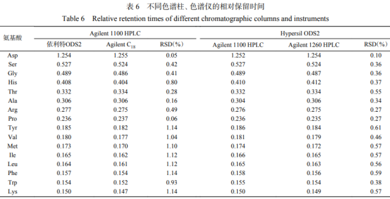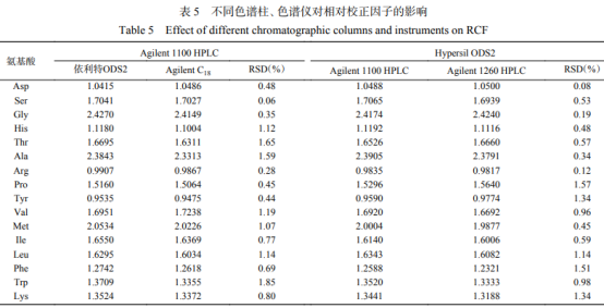 采用依利特HypersilODS2(250mm×4.6mm,5μm)、AgilentC18(250mm×4.6mm,5μm)色譜柱在Agilent1100HPLC測(cè)定16種氨基酸的相對(duì)校正因子影響見表5。由表5可知,16種氨基酸的相對(duì)校正因子在不同色譜柱下的RSD均小于1.85%,說(shuō)明相對(duì)校正因子在不同品牌色譜柱下具有良好的重復(fù)性。