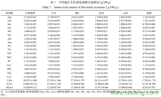 對(duì)六個(gè)不同地區(qū)的羊肚菌氨基酸測(cè)定結(jié)果顯示,羊肚菌中氨基酸含量豐富,且富含人體所需的必需氨基酸和藥用氨基酸,有較高的食用價(jià)值,可作為人體必需氨基酸營(yíng)養(yǎng)的天然來(lái)源之一,且極具開發(fā)作為補(bǔ)充氨基酸的功能性食品;其鮮味、甜味氨基酸含量較高,是開發(fā)食品調(diào)味劑的天然寶庫(kù)。綜上所述,羊肚菌在食品、醫(yī)療領(lǐng)域具有很大的開發(fā)潛力和廣闊的應(yīng)用前景。