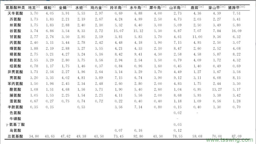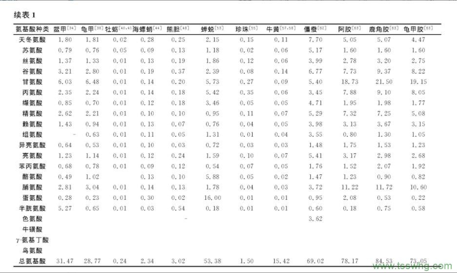 我國動物藥資源非常豐富,且療效顯著,臨床應用廣泛,因此近年來國內(nèi)外學者對于動物藥的研究也日益增多。但由于許多動物藥來源于瀕危動物,且市場上的偽劣、混淆品越來越多,因此研究其中發(fā)揮主要藥理作用的活性物質(zhì)更有助于尋找可替代的藥物或合成新藥。筆者通過查閱文獻,總結(jié)并列舉了24味動物藥中多種水解氨基酸的含量及總氨基酸含量(見表1)。由表1可知,羚羊角、水牛角、山羊角、鹿茸、穿山甲、豬蹄甲、蟬蛻、僵蠶、阿膠、鹿角膠、龜甲膠的總氨基酸含量均超過50%,而牡蠣、海螵蛸、熊膽、珍珠的總氨基酸含量均低于5%,其中牡蠣的總氨基酸含量最少。