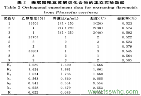 設(shè)計(jì)三因素三水平的正交實(shí)驗(yàn),見表1。在不同的乙醇濃度、料液比和溫度條件下,提取貓眼豆中的黃酮類化合物,浸提2次,每次6h,選出最優(yōu)的提取條件。