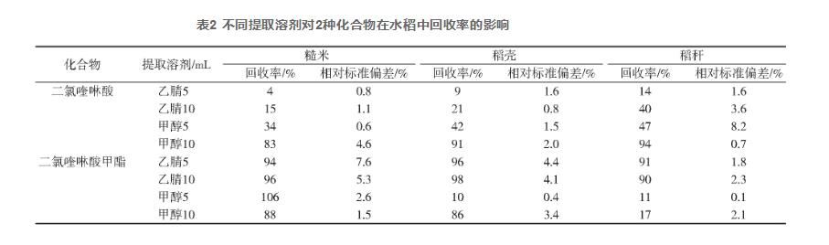 在0.1mg/kg質(zhì)量分?jǐn)?shù)添加水平,樣品量均為5g的條件下,比較了甲醇和乙腈2種提取溶劑對(duì)二氯喹啉酸和二氯喹啉酸甲酯的提取效率的影響。結(jié)果表明(見表2):當(dāng)采用乙腈作為二氯喹啉酸甲酯的提取溶劑時(shí)可以達(dá)到更好的提取效果,添加回收率符合農(nóng)藥殘留分析標(biāo)準(zhǔn)。當(dāng)采用2倍樣品量的甲醇作為二氯喹啉酸提取溶劑時(shí),能夠獲得更高的回收率。