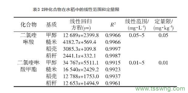 二氯喹啉酸和二氯喹啉酸甲酯在水稻樣品的3種基質(zhì)中,質(zhì)量濃度與相應(yīng)的峰面積呈良好的線性關(guān)系(見表3)。