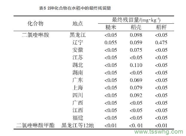 對(duì)于水稻的不同部分(糙米、稻殼和稻稈),二氯喹啉酸在稻殼中的分布較廣,糙米和稻稈中分布較少,因此稻谷經(jīng)過脫殼可以有效減少二氯喹啉酸的殘留。