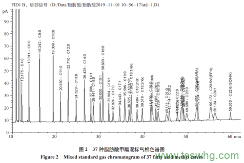 通過上述實(shí)驗(yàn)操作經(jīng)氣相色譜分析后可得到鮮馬奶的脂肪酸組成氣相色譜圖(如圖1),37種脂肪酸甲酯混標(biāo)氣相色譜圖(如圖2)。