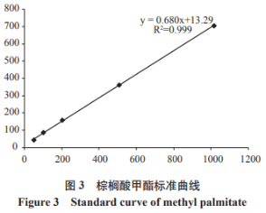 將1.1中的棕櫚酸甲酯標(biāo)準(zhǔn)品用正己烷稀釋成濃度梯度為:50.75μg/mL、101.5μg/mL、203.0μg/mL、507.5μg/mL、1015μg/mL的標(biāo)準(zhǔn)曲線溶液,直接上機(jī)分析,以棕櫚酸甲酯的濃度為橫坐標(biāo),峰面積為縱坐標(biāo),標(biāo)準(zhǔn)曲線計(jì)算得到線性方程為:y=0.680x+13.29,相關(guān)系數(shù)為R2=0.999,這說明棕櫚酸甲酯在50.75~1015μg/mL范圍內(nèi)有良好的線性關(guān)系,線性曲線如圖3。