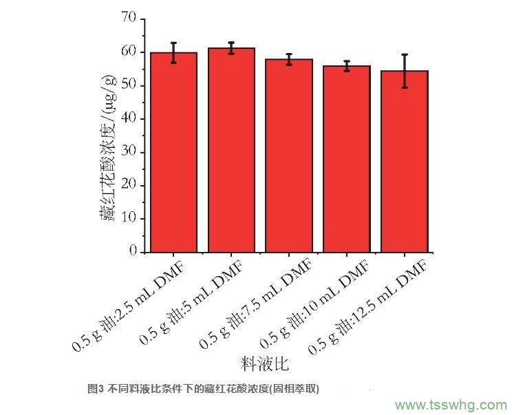 如圖3所示,固相萃取的結(jié)果表明:當(dāng)料液比為油:正己烷=0.5 g:5 mL時(shí),固相萃取得到藏紅花酸濃度最高,為61.27 μg/g。