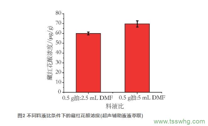 超聲輔助液液萃取的實(shí)驗(yàn)結(jié)果表明:隨DMF體積逐漸增加,溶液逐漸渾濁,7.5 mL及其以上的溶液清澈度很低,不具有透光性。DMF體積在12.5 mL時(shí),溶液離心后不分層。因此,DMF體積為7.5、10 mL和12.5 mL的樣品不能進(jìn)行液相分析。對2.5 mL DMF和5 mL DMF的梔子油萃取物進(jìn)行液相分析,結(jié)果如圖2所示:5 mL DMF時(shí)藏紅花酸濃度平均值為69.65 μg/g,高于2.5 mL DMF時(shí)藏紅花酸濃度平均值為59.93 μg/g。因此,在超聲輔助液液萃取條件下,最優(yōu)料液比選擇0.5 g油:5 mL DMF。