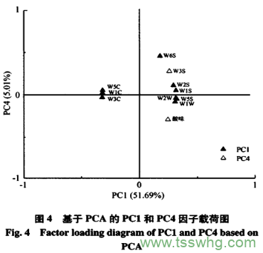 在對自然發(fā)酵和L.plantarum純種發(fā)酵制備,酸豇豆風(fēng)味和滋味指標(biāo)相對強度進行比較分析的基礎(chǔ)上,本研究使用PCA對21個樣本的品質(zhì)進行了降維分析,結(jié)果發(fā)現(xiàn)其信息主要集中在前4個主成分,累計方差貢獻率為87.53%。第一主成分(Principalcomponentl,PCI)的貢獻率為51.69%,由W1C、W5S、W3C、W6S、W5C、W1S、WlW、W2S和W2W9個風(fēng)味指標(biāo)構(gòu)成;PC2的貢獻率為17.08%,由后味A(澀味的回味)和后味B(苦味的回味)2個缺陷型滋味指標(biāo)構(gòu)成lPC3的貢獻率為13.74%,由苦味、澀味、咸味、鮮味和豐度5個滋味指標(biāo)構(gòu)成;PC4的貢獻率為5.01%,由酸味和W3S2個指標(biāo)構(gòu)成。因酸味為酸豇豆的特征性滋味指標(biāo),因而本研究選取PC1和PC4進行了因子載荷圖的繪制,結(jié)果如圖4所示。