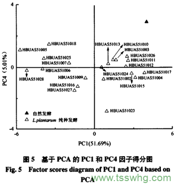 由圖5可知,較之自然發(fā)酵,L.plantarum純種發(fā)酵制備的酸豇豆樣品在空間排布上整體偏向左下方,結(jié)合圖4可知,L.plantarum純種發(fā)酵有利于提升多數(shù)酸豇豆的品質(zhì)。由圖5亦可知L.plantarumHBUAS51023和L.plantarumHBUAS51005在空間排布上最偏向Y軸負方向或X軸負方向,具有最強的產(chǎn)酸或產(chǎn)香能力,但其風(fēng)味和滋味品質(zhì)不均衡,雖然L.plantarumHBUAS51009、L.plantarumHBUAS51016和L.plantarumHUAS51027產(chǎn)酸或產(chǎn)香能力均不最佳,但其制備的酸豇豆品質(zhì)均衡,可用于后續(xù)具有優(yōu)良酸豇豆發(fā)酵特性乳酸菌的進一步篩選。