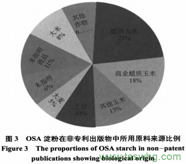商業(yè)生產(chǎn)的OSA淀粉可以從生產(chǎn)商中購買。蠟質(zhì)玉米和普通玉米是商業(yè)OSA淀粉的主要來源。關(guān)于玉米淀粉的大部分文獻(xiàn)都指定了植物來源為蠟質(zhì)玉米,如圖3所示。在沒有指定品種的文獻(xiàn)中,只有3種指定了高直鏈淀粉,20%的文獻(xiàn)報告了淀粉原料是直鏈淀粉。其余文獻(xiàn)中的玉米淀粉也極有可能來源于蠟質(zhì)玉米。
