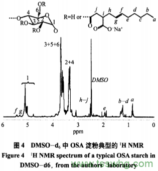 Shih等人以D2O作為溶劑,淀粉樣品部分溶解,然后進(jìn)行NMR表征。水溶性問題可以通過在堿性溶液中水解降低淀粉分子量或者用α一淀粉酶對樣品進(jìn)行預(yù)處理來解決。然而,OSA淀粉是兩親性大分子,通過疏水作用在水中團(tuán)聚,造成NMR表征結(jié)果重要峰強(qiáng)度減弱,最終導(dǎo)致DS計(jì)算結(jié)果偏差。