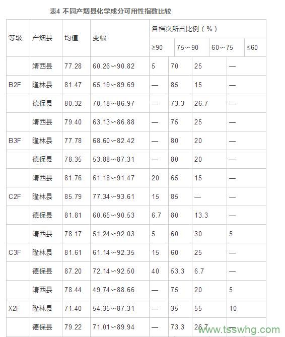 由表4可知,不同產(chǎn)煙縣間烤煙化學(xué)成分可用性指數(shù)存在一定差異。B2F等級(jí)煙葉化學(xué)成分可用性指數(shù)以隆林縣最高,德保縣次之,靖西縣最低;靖西縣有5%的樣本處于“好”檔次,隆林縣有85%的樣本處于“較好”檔次,德??h有73.3%的樣本處于“較好”檔次。B3F等級(jí)煙葉化學(xué)成分可用性指數(shù)以靖西縣最高,德??h次之,隆林縣最低;靖西縣有75%的樣本處于“較好”檔次,隆林縣和德??h有80%的樣本處于“較好”檔次。C2F等級(jí)煙葉化學(xué)成分可用性指數(shù)以隆林縣最高,德??h次之,靖西縣最低;靖西縣有20%的樣本處于“好”檔次,隆林縣有100%的樣本處于“較好”以上檔次,德??h有80%的樣本處于“較好”檔次。C3F等級(jí)煙葉化學(xué)成分可用性指數(shù)以德??h最高,隆林縣次之,靖西縣最低;靖西縣各有5%的樣本處于“好”和“稍差”檔次,隆林縣有75%的樣本處于“較好”以上檔次,德保縣有93.3%的樣本處于“較好”以上檔次。X2F等級(jí)煙葉化學(xué)成分可用性指數(shù)以德??h最高,靖西縣次之,隆林縣最低;靖西縣有75%的樣本處于“較好”檔次,隆林縣有55%的樣本處于“中等”檔次,德??h有73.3%的樣本處于“較好”檔次。綜上,B2F、C2F等級(jí)煙葉化學(xué)成分可用性以隆林縣最高,B3F等級(jí)煙葉化學(xué)成分可用性以靖西縣最高,C3F和X2F等級(jí)煙葉化學(xué)成分可用性以德??h最高。