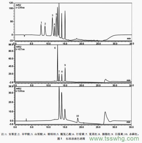 2.1.1檢測波長的選擇實(shí)驗(yàn)采用二極管陣列檢測器檢測,在波長190~600nm范圍內(nèi)對10種組分進(jìn)行波長掃描,得到各組分的最大吸收波長,為確保各組分有足夠的靈敏度以及盡量減少基質(zhì)干擾,實(shí)驗(yàn)選擇了230nm、427nm和530nm作為檢測波長。230nm作為苯甲酸、山梨酸、脫氫乙酸、安賽蜜、糖精鈉的檢測波長,檸檬黃、日落黃、莧菜紅和胭脂紅的檢測波長為427nm,530nm波長下測定赤蘚紅。標(biāo)準(zhǔn)溶液色譜圖見圖1。