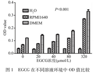 實驗設置了H2O、RPMI1640、DMEM(pH=7)3種溶液體系,比對不同的溶液對EGCG氧化聚合的影響。如圖1所示,在相同EGCG濃度下,RPMI1640、DMEM兩種培養(yǎng)基的OD578值極顯著高于H2O(P<0.001);對比兩種培養(yǎng)基,DMEM的OD578值高于RPMI1640,即三種溶液體系促進EGCG氧化聚合率的排序為:DMEM>RPMI1640>H2O。